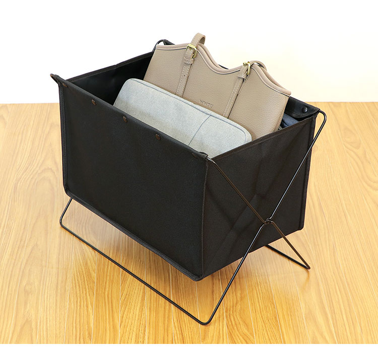 LIV PLUSの折りたたみ式フロアーラック(ボックスタイプ・Mサイズ)は、バッグや手荷物を床に直接置かずにスマートに収納できます。