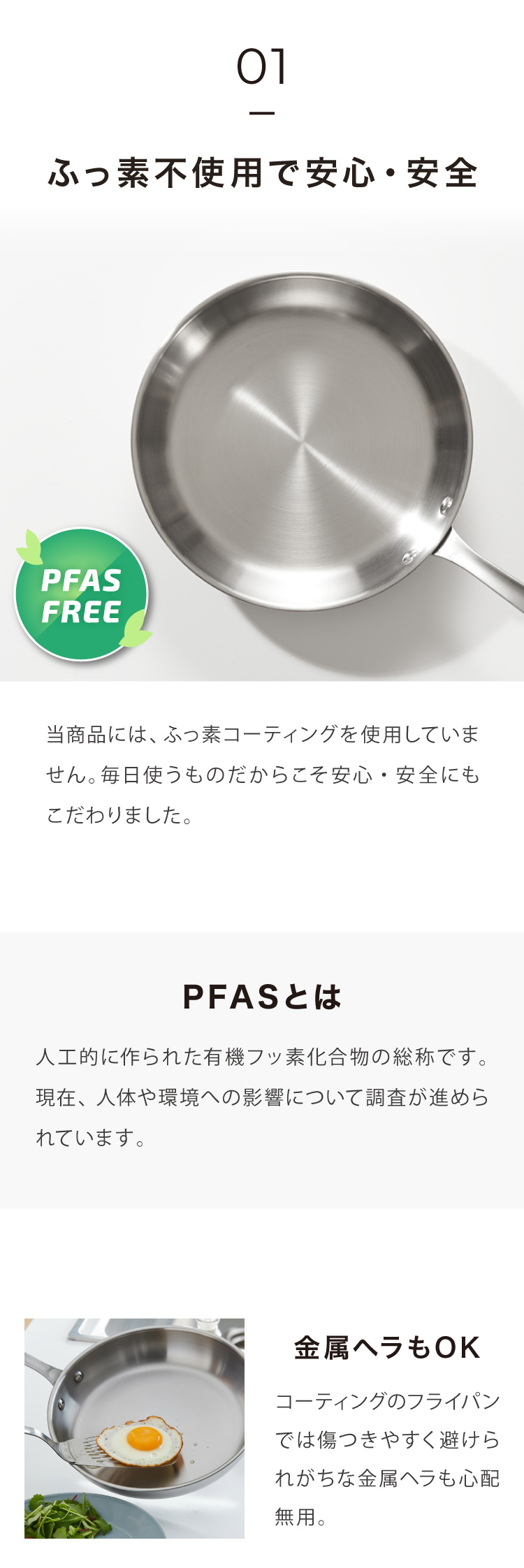 コーティング無しで、ステンレス鋼とアルミニウムの多層構造を採用したシェフズパン。