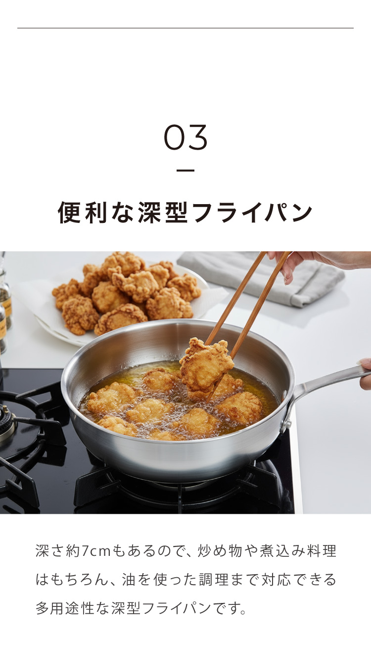 炒め物や煮込み料理はもちろん、揚げ物まで対応できる多用途性。