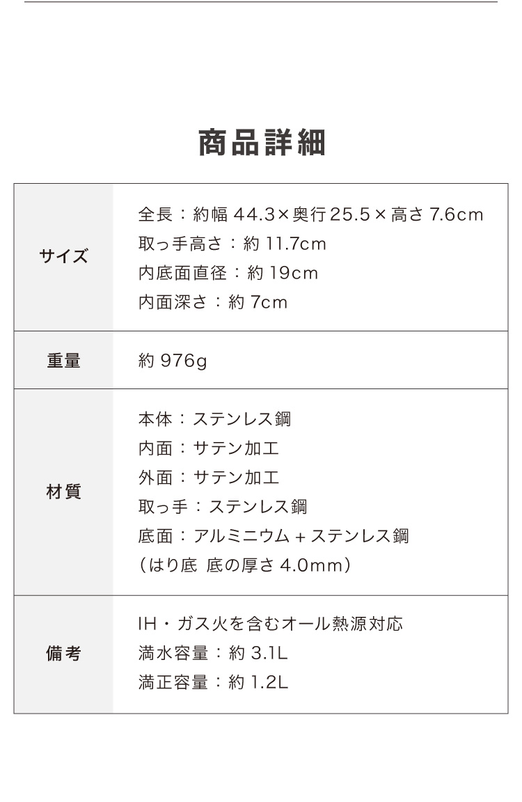 底:アルミニウム+ステンレス鋼(はり底 底の厚さ:約4.0mm)