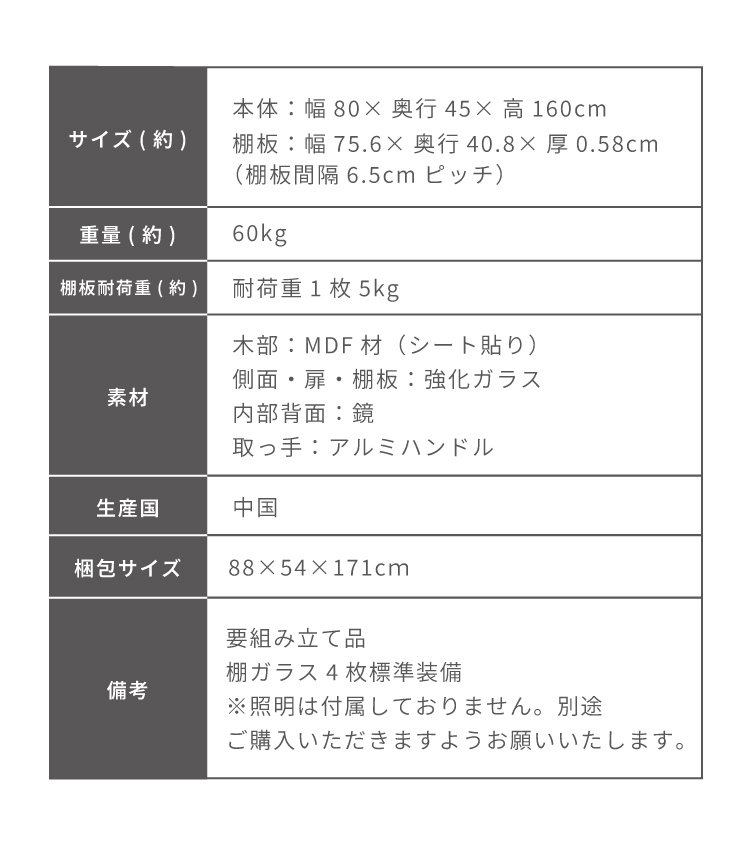 マッキンレー コレクションケース単品 160 幅80×奥行45×高さ160cm ハイタイプ コレクションラック ガラスケース 開梱設置無料 鍵付 鏡付 フィギュア 代引不可