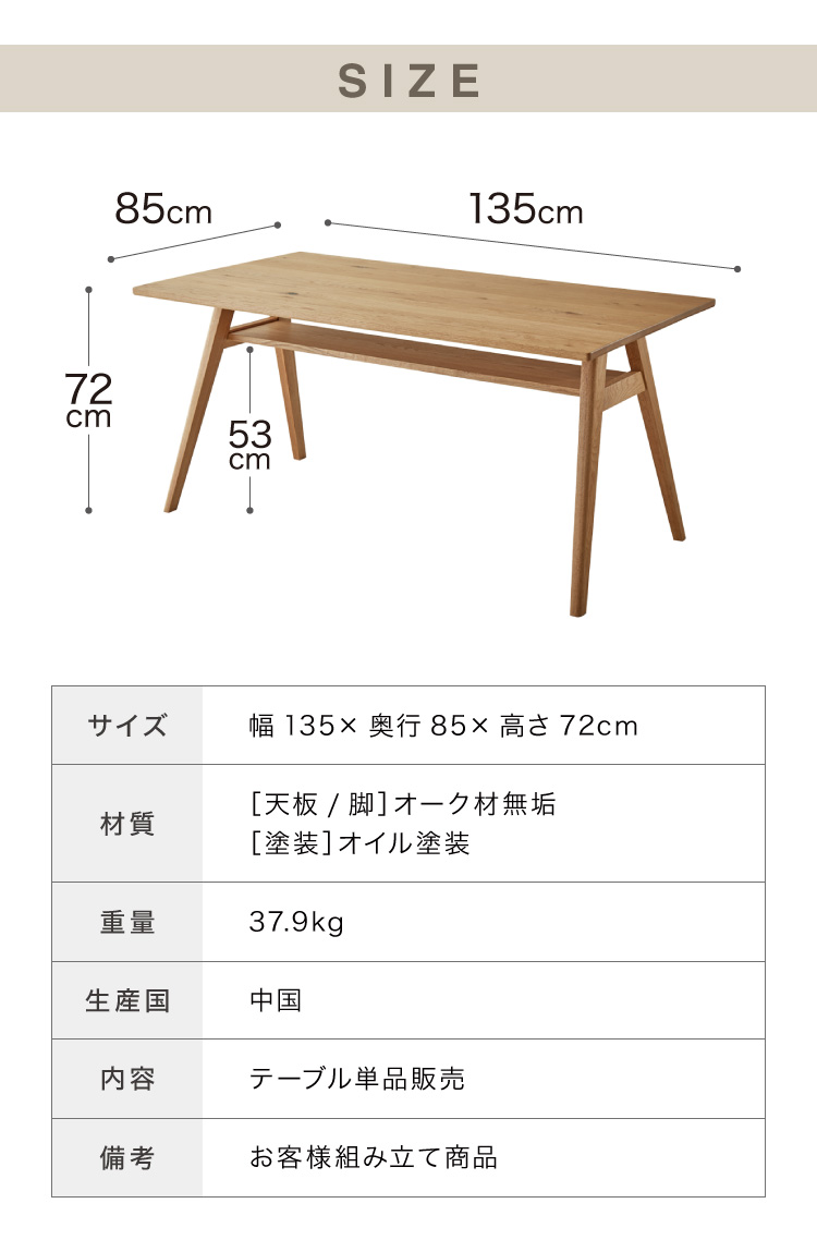 ダイニングテーブル 単品 幅135 高さ72 オーク無垢材 天然木 135×85 4人掛け 棚付き 北欧 おしゃれ 木製 食卓テーブル 木目 ナチュラル デスク 代引不可