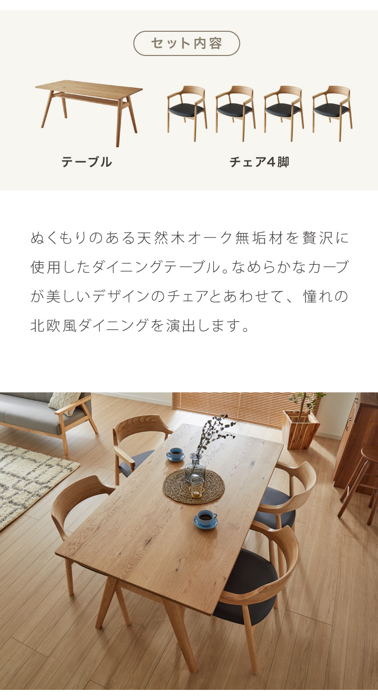 ダイニングセット ダイニング5点セット 4人掛け 幅135 高さ72 オーク無垢材 天然木 棚付き ダイニングチェア 天然木 椅子 ナチュラル おしゃれ 代引不可