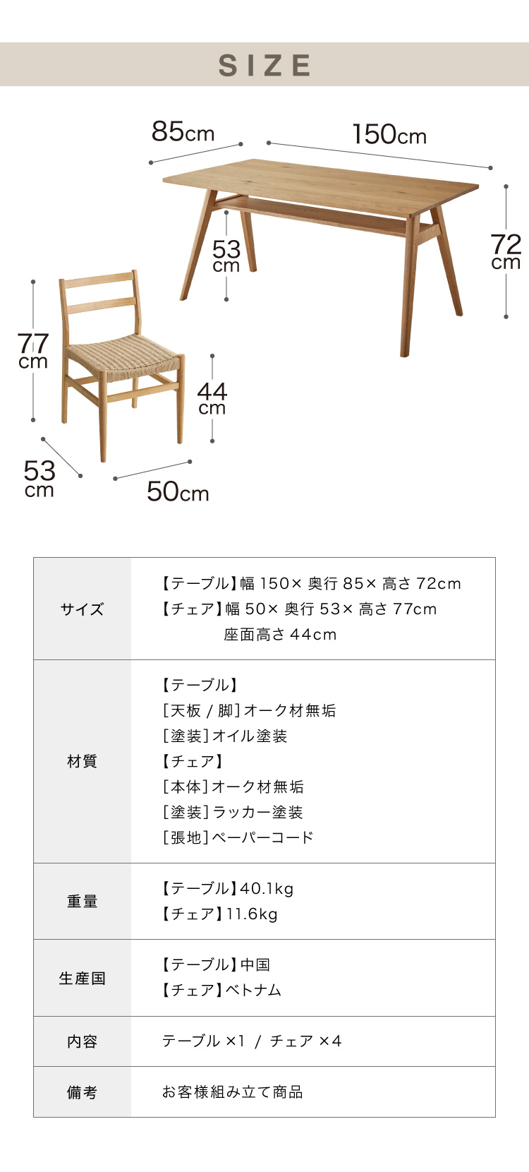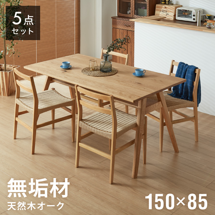 ダイニングセット ダイニング5点セット 4人掛け 幅150 高さ72 オーク無垢材 天然木 棚付き ダイニングチェア ペーパーコードチェア 天然木 椅子 代引不可