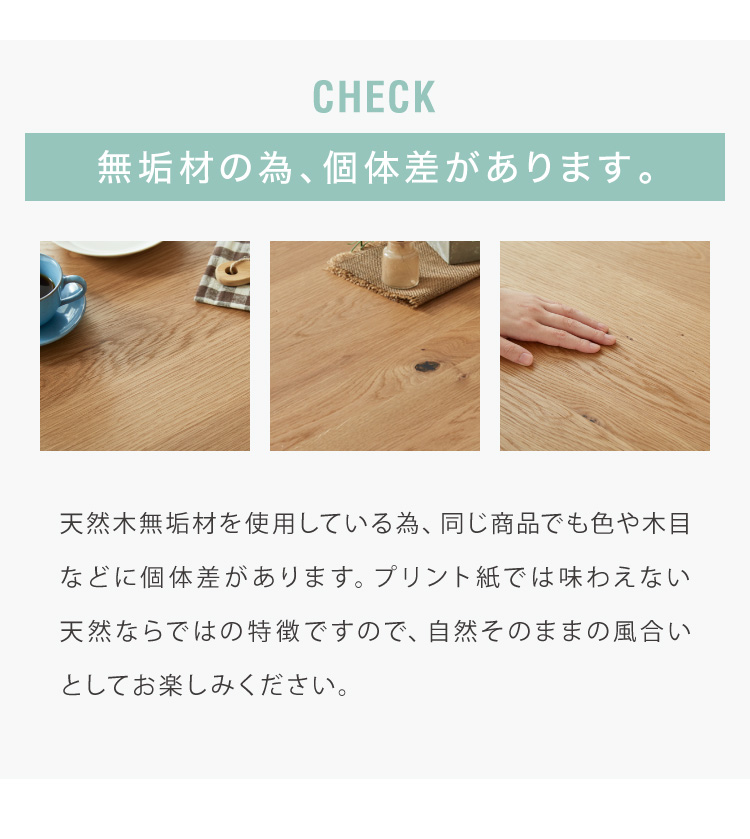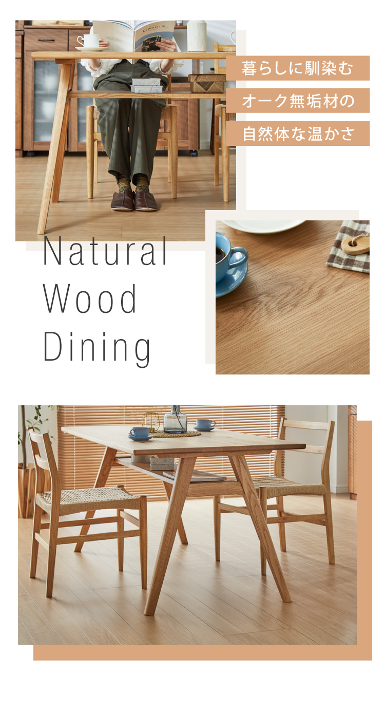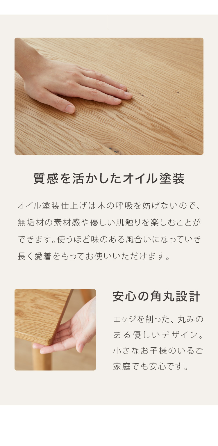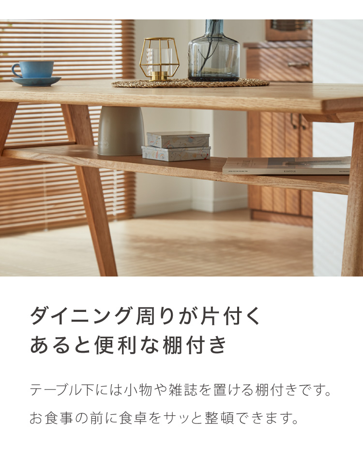 テーブルはぬくもりのある天然木オーク材を使用。天板下にはあると便利な小棚付き。