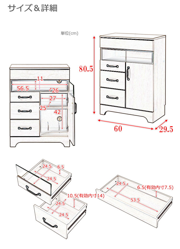 引出し内寸:(約)幅(小)24.5(大)53.5×奥行24.5×深さ(浅)6.5(深)10.5(有効14)cm
