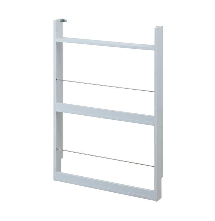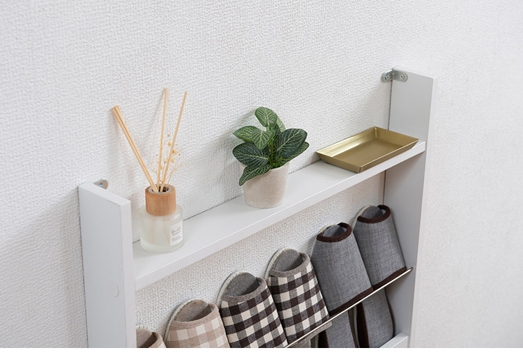 巾木よけ加工をしているので、壁にピッタリ設置ができる超薄型スリッパラック。上段の棚には、芳香剤や観葉植物、鍵などを置くスペースとして。1段にスリッパを3足収納できます。薄型で邪魔にならないのが魅力です。