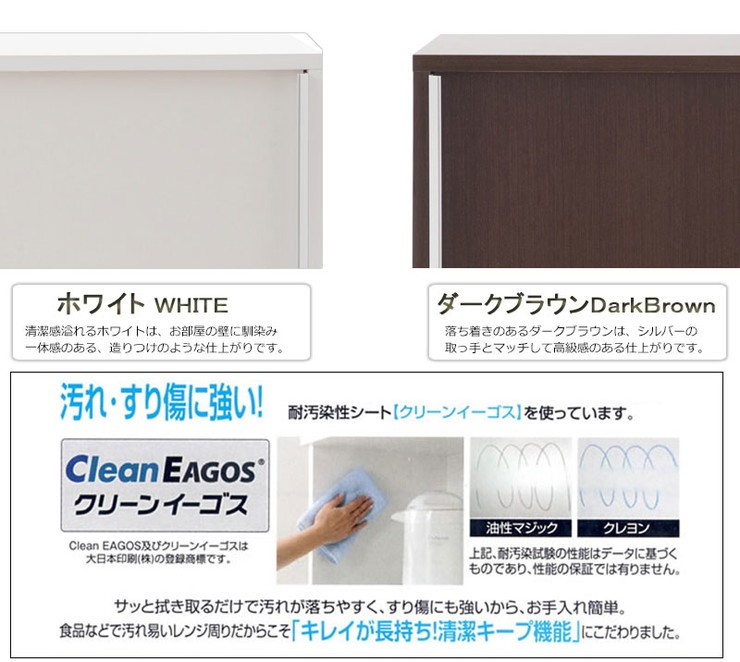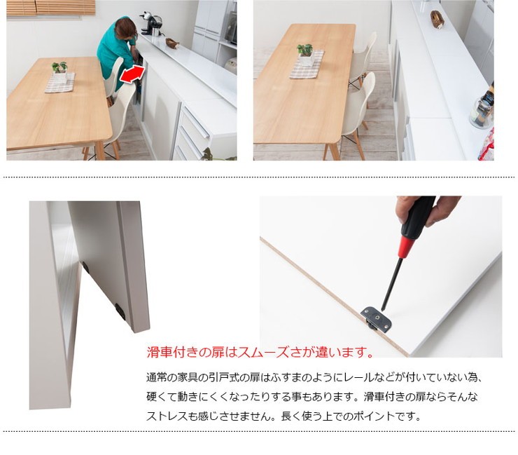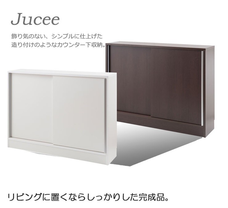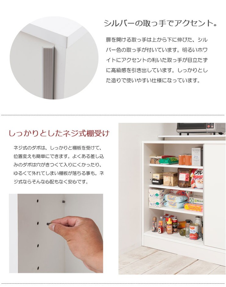 ■商品について/シンプルに仕上げたスタイリッシュシリーズ。引き戸式のカウンター下収納は、滑車付きで動きもスムーズ。引き戸式ならわずかなスペースで開閉が可能。取り出し易い引き戸式でキッチンスペースが使い易くなります。リビング・ダイニングを効率よく使えて、綺麗に収納。CDやDVD、コミックなども綺麗に収納ができます。他のシリーズと合わせて、キッチンやリビングなどでお洒落に収納できます。滑車付きの扉を開ける取っ手は上から下に伸びた、シルバー色の取っ手が付いています。しっかりとした造りで使いやすい仕様になっています。