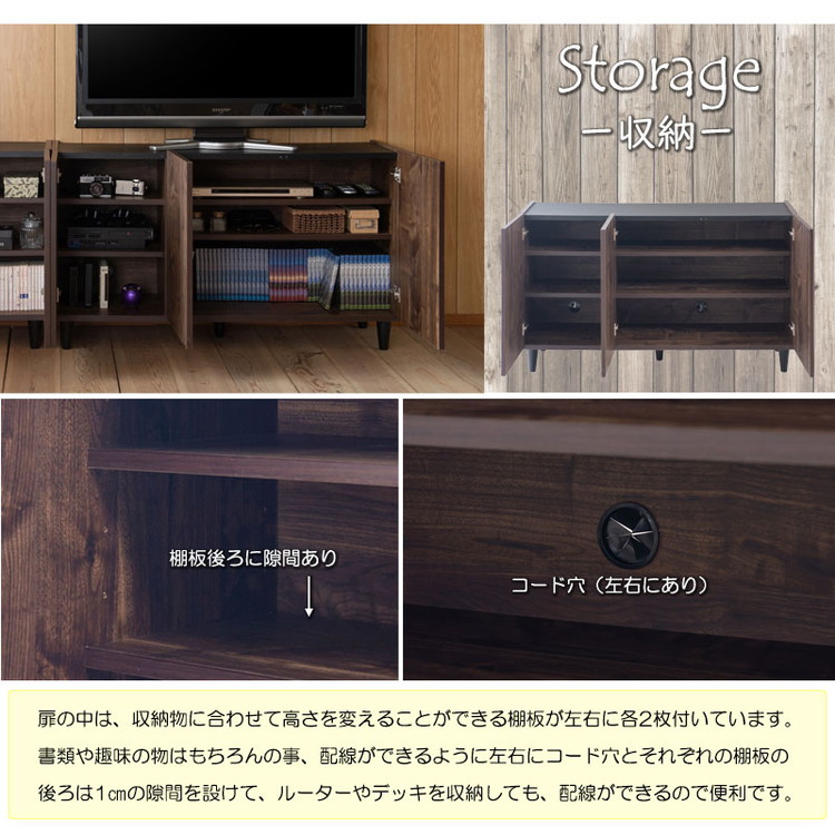 書類や趣味の物はもちろん、ルーターやデッキを収納しても配線ができるようにコード穴と可動棚後部に約1cmの隙間を設けているので便利。脚は取付式で外しての使用も可能。