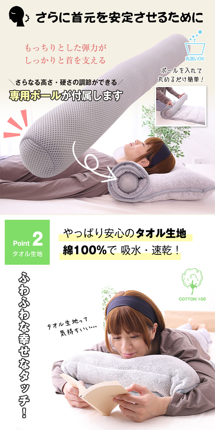 自分好みに高さや形状を自由にカスタムできる、綿100%生地を 使用したふんわりタオル枕。