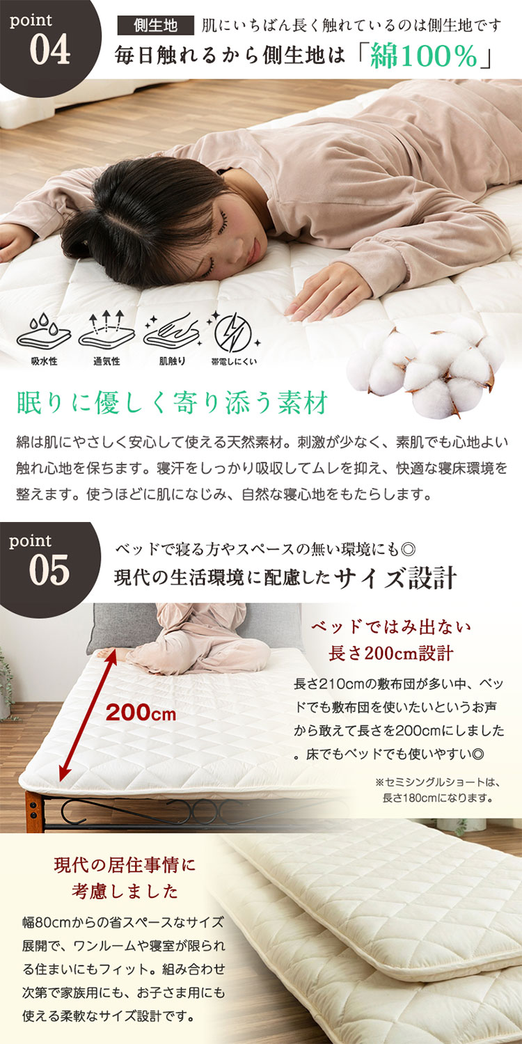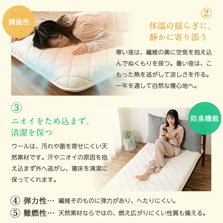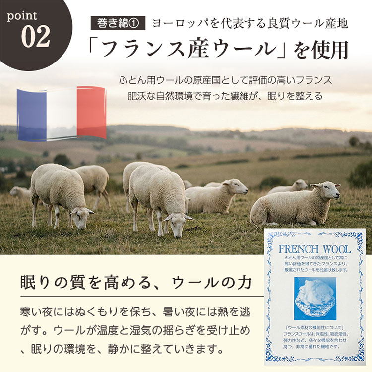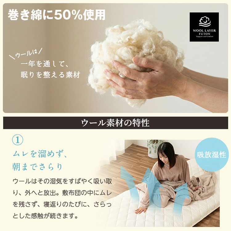 ・中わたにウールをブレンドすることで、夏涼しく冬暖かい。また優れた吸放湿性・弾力性・防臭性・難熱性を実感できます