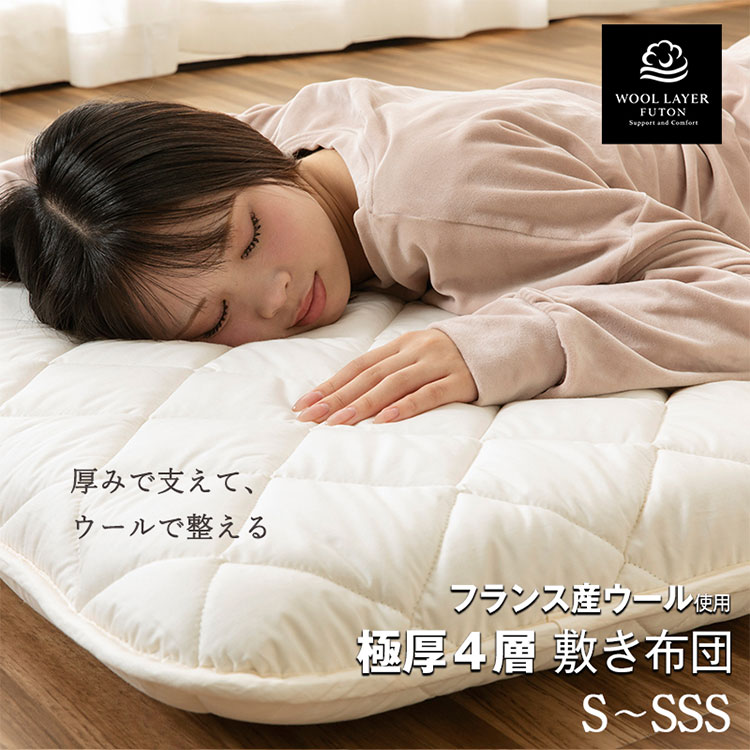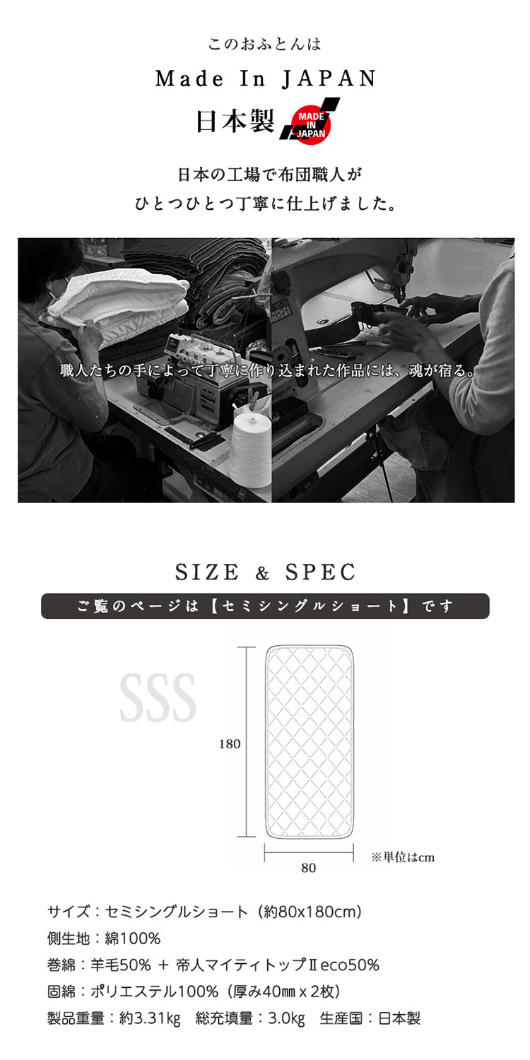 敷き布団 セミシングルショート 日本製 羊毛100%使用 80×180 ウール敷布団 消臭 吸湿性抜群 ウール100% ウール 洗える 丸洗い可能 消臭ウール布団