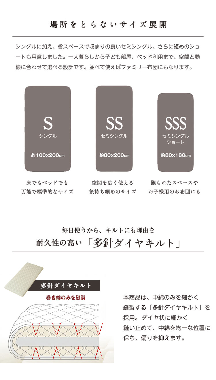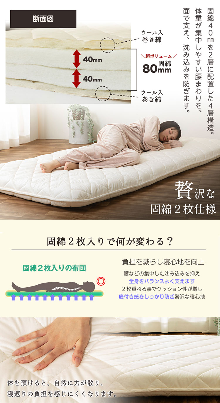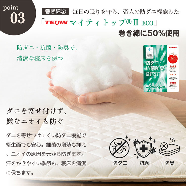 ・中わたにウールをブレンドすることで、夏涼しく冬暖かい。また優れた吸放湿性・弾力性・防臭性・難熱性を実感できます