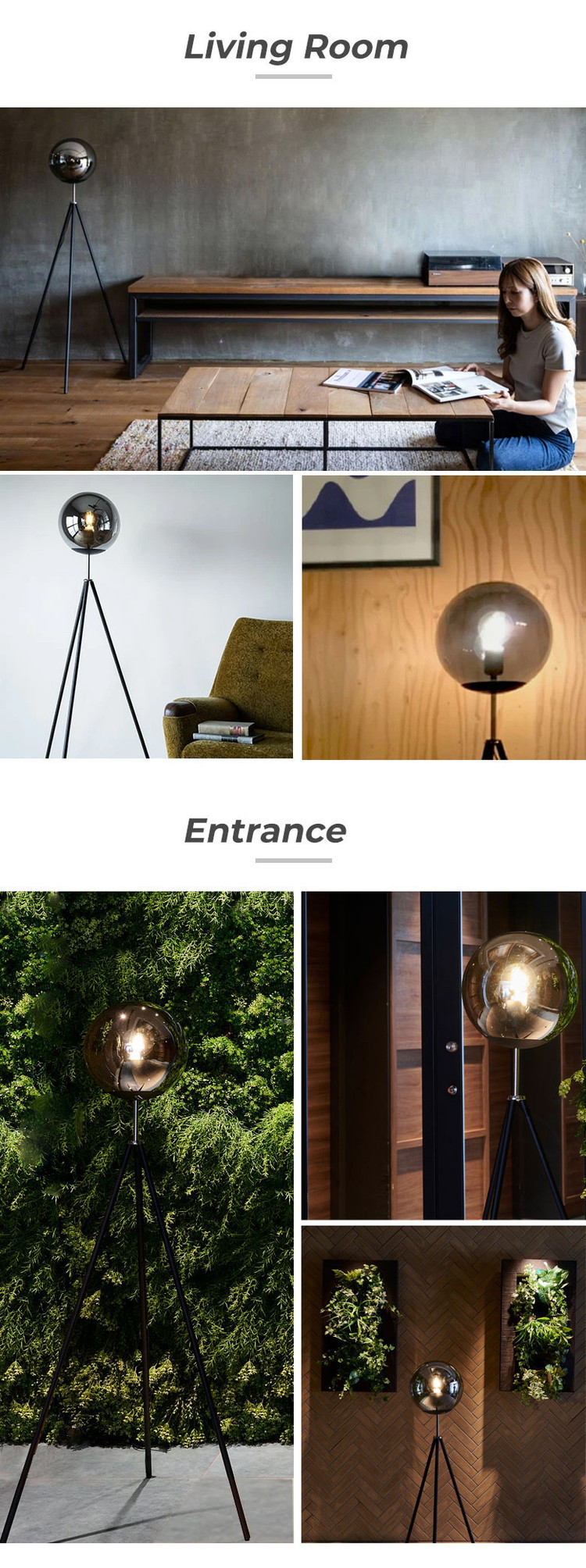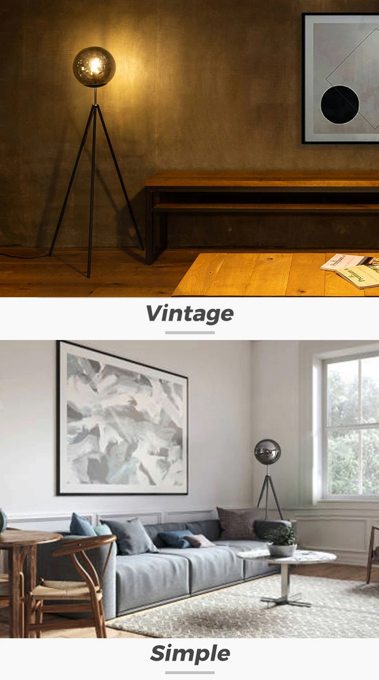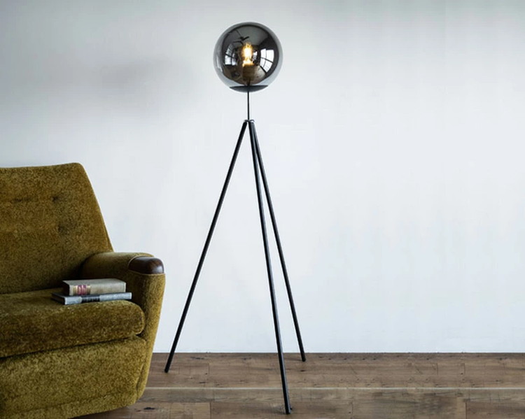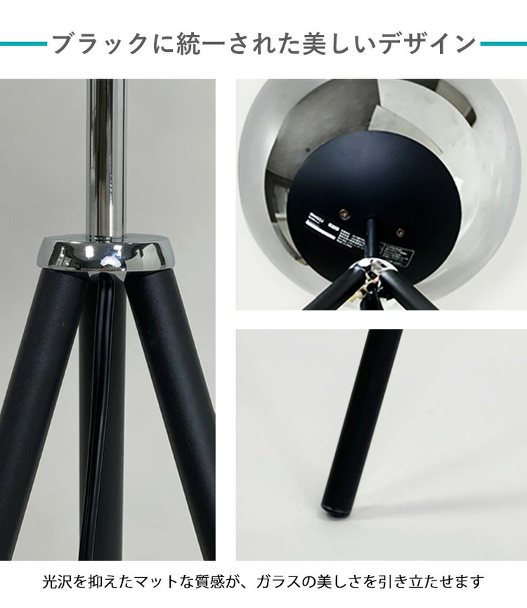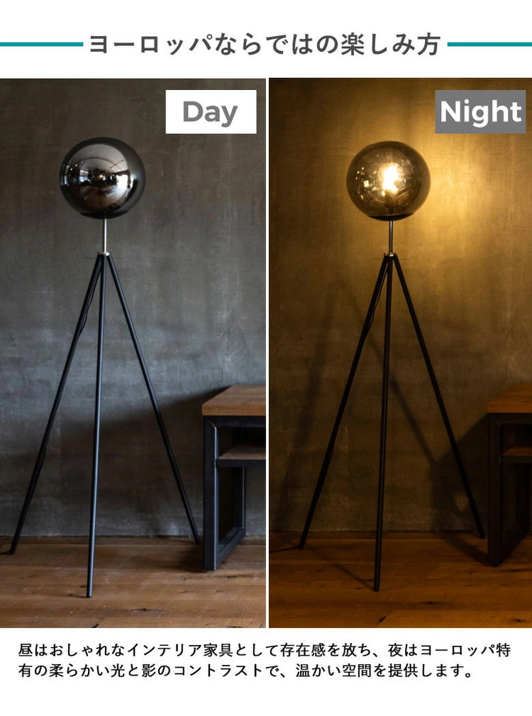 ガラスボールとどこでも設置できる三脚の組み合わせ。スモークグラスを使ったガラスボールは光が直接当たらないので光がやわらかくCORSAVYよりも明るさではなくムードを作る照明としての立ち位置です。