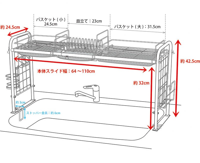 シンク収納ラック 水切りラック 幅64~110cm 伸縮式 スライド式 奥行24.5cm 高さ42.5cm 耐荷重:上部20kg ステンレス 錆びにくい 代引不可