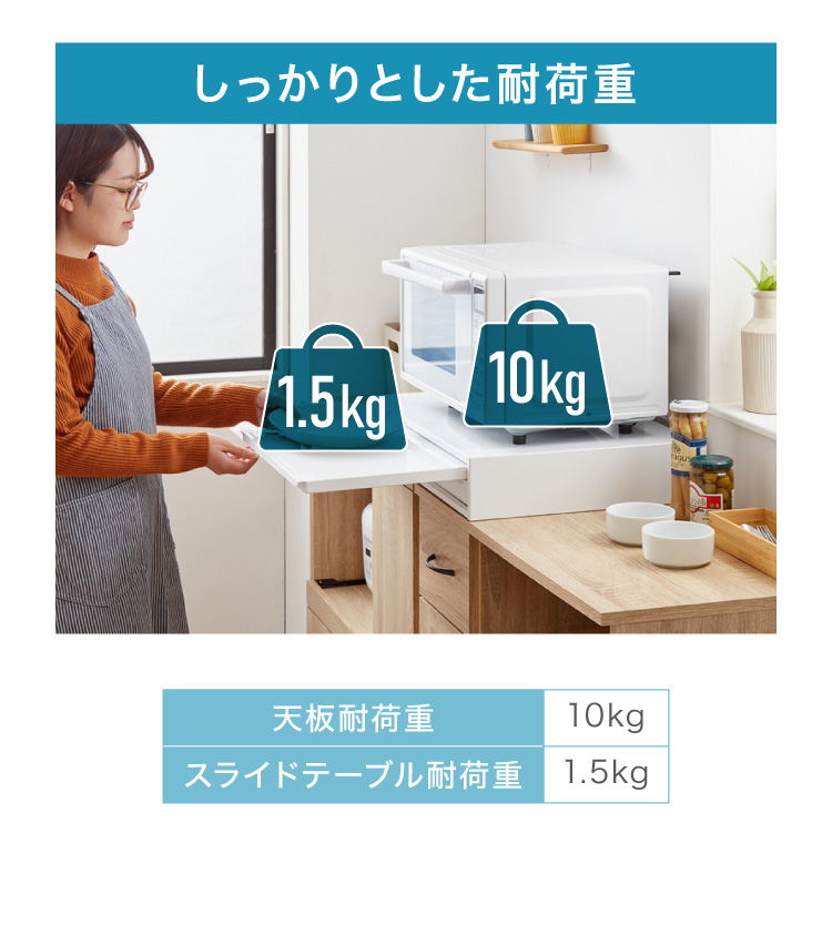 電子レンジや炊飯器など、キッチン家電周りにあると便利なちょい置きスペースができるキッチンサポートテーブルです。