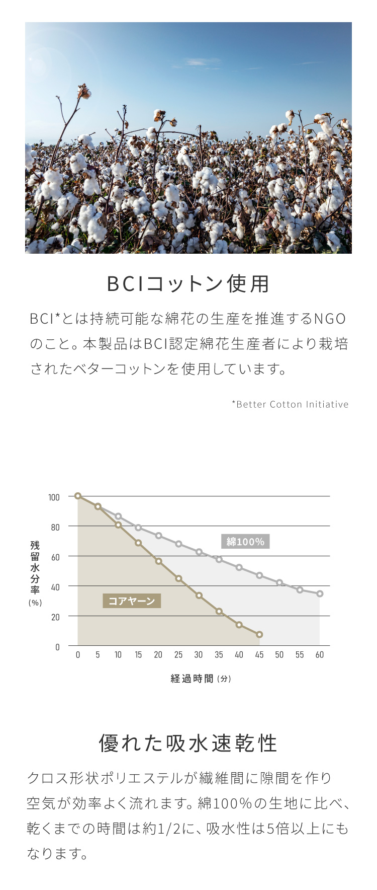 綿の持つ肌へのやさしさ・優れた吸水性・通気性はそのままに、ポリエステルの高い強度・速乾性を合わせ持ちます。