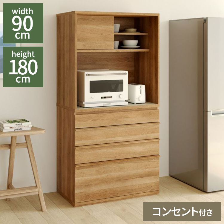 キッチンボード 食器棚 レンジ台 幅90cm 高さ180cm ナチュラルブラウン 引出4段 コンセント付 メラミン天板 キッチン 家電 収納 コモピア 代引不可