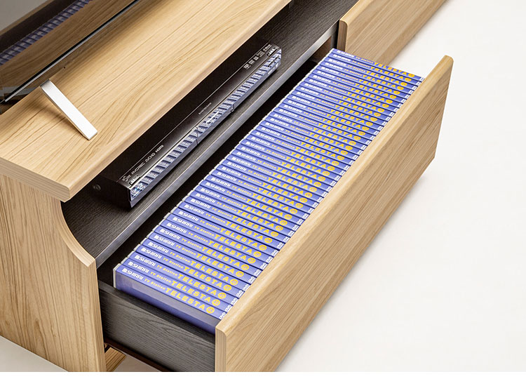 ・スチール製で丈夫なスライドレールの引き出しには、左右それぞれ44枚、計88枚のDVDが入ります。