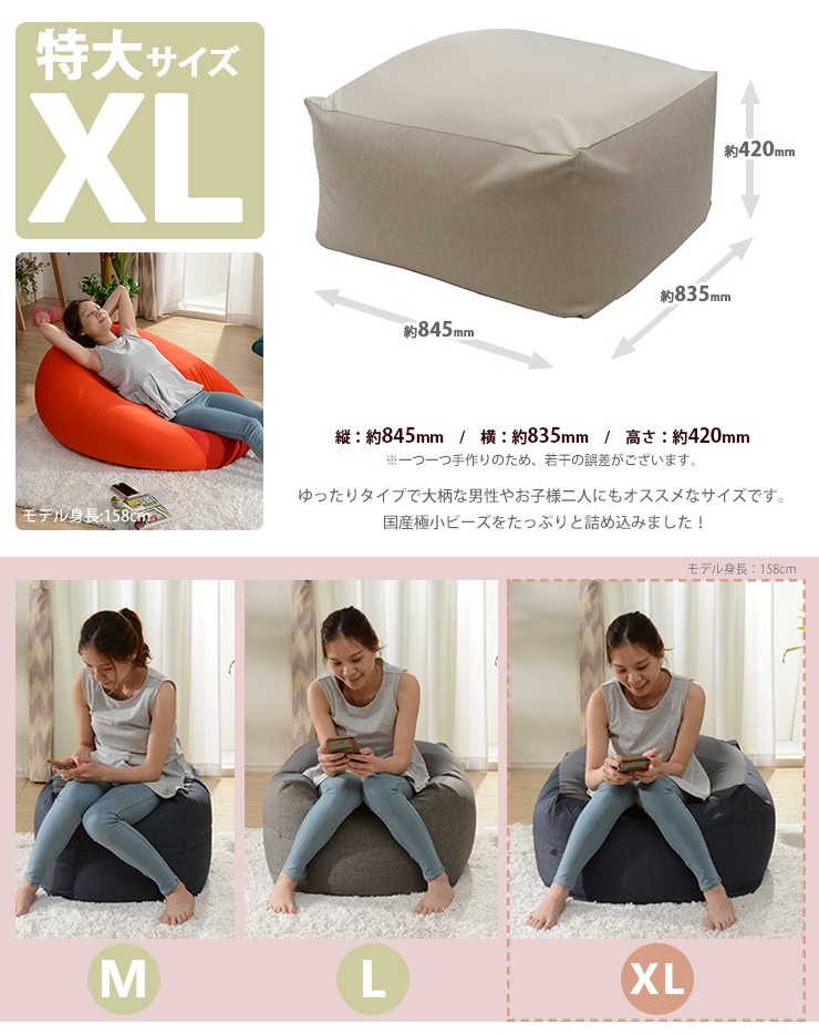 日本製 ビーズクッション 四角形 幅83.5 奥行き84.5 ビーズソファ QUBE XL 国産 洗えるカバー 特大 おしゃれ かわいい 洗濯 代引不可