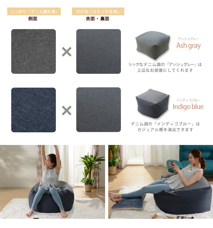 ※アッシュグレーとインディゴブルーのスティチ生地(伸びる生地)は同色のグレーの生地です。