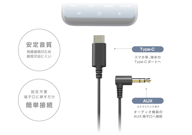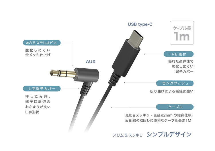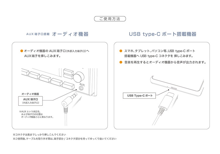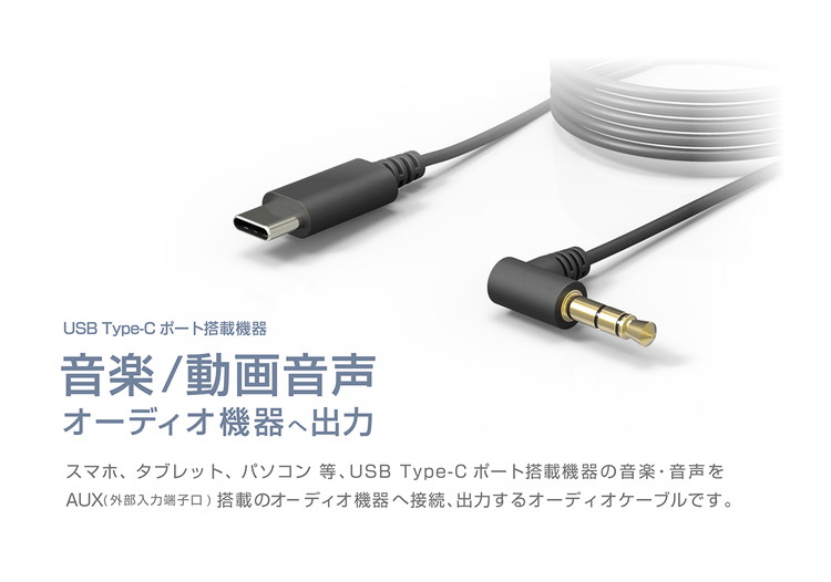 ●USB Type-C ポート搭載機器の音楽をAUX(外部入力端子口)搭載のカーオーディオ/オーディオ機器で本格サウンド再生するオーディオケーブル。