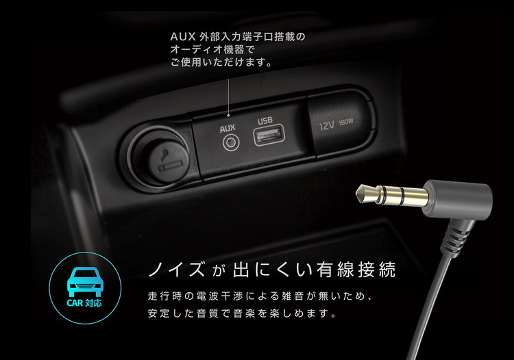 ※カーオーディオにAUX端子口(φ3.5ステレオ)が無い車では、本製品を使用できません。