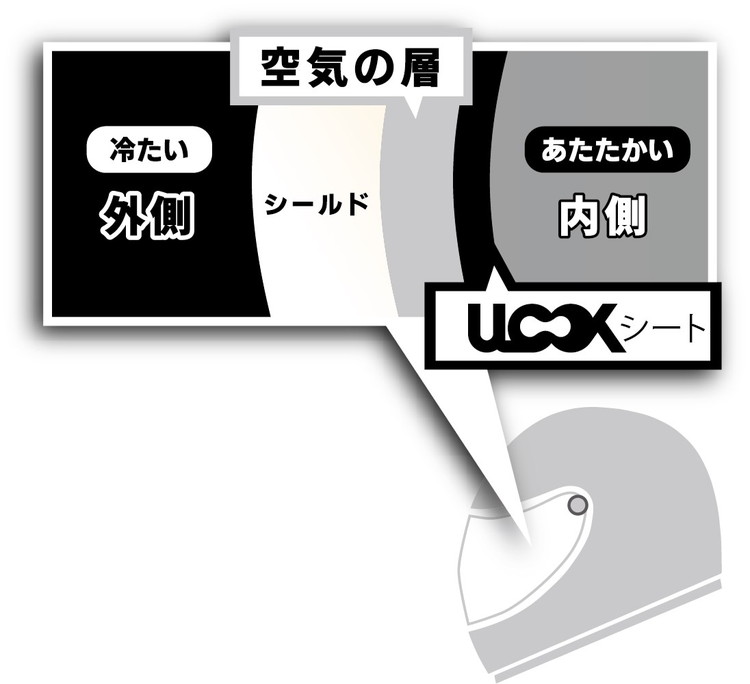 UGAM社独自開発の複合素材シートが吸湿放湿を繰り返し、ヘルメット内の曇りを制御。安全なライディングに貢献します。