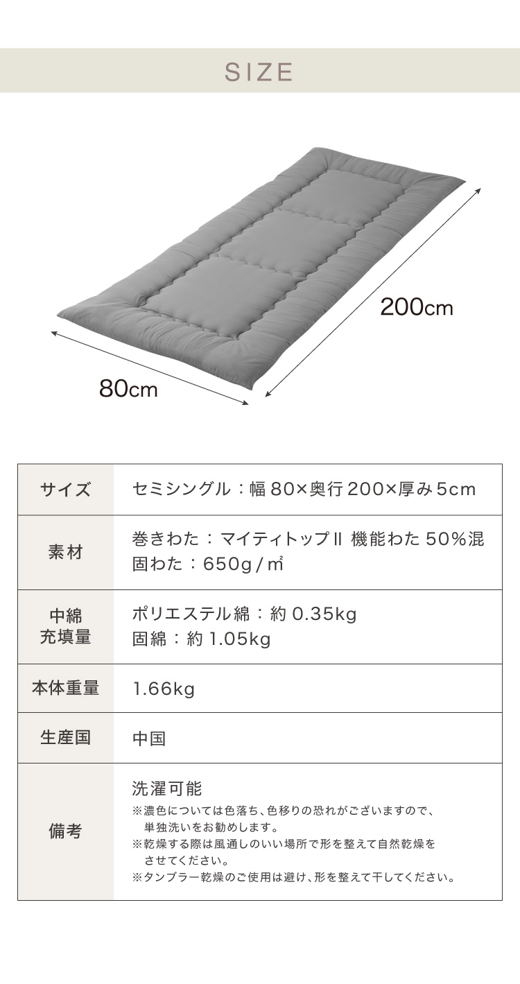 敷き布団 セミシングル ボリュームタイプ 固綿 三層式 80×200cm 抗菌 防臭 ほこりの出にくい 布団 洗える 敷き ふとん エコテックス認証製品