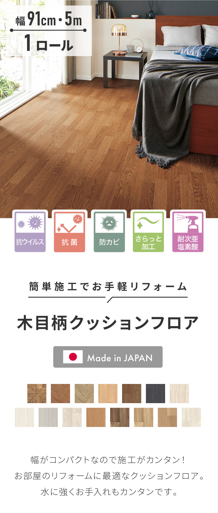 クッションフロア 91cm×5m 木目柄 フリーカットシート 日本製 撥水 抗菌 防カビ 傷防止 フロアマット クッションシート ダイニングラグ 代引不可