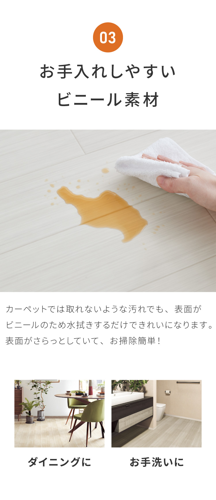 塩ビ素材なので撥水・防汚機能が施されており、汚れてもサッと拭きとれるフリーカットシート。ちょっとした模様替え、修理を簡単に行なえる敷くだけ簡単DIY。退去時の費用が気になる賃貸住宅のお部屋にもおススメです。さらさらの表面で汚れが詰まらず衛生的。汚れてもお掃除のしやすい素材で快適な暮らしづくりを。