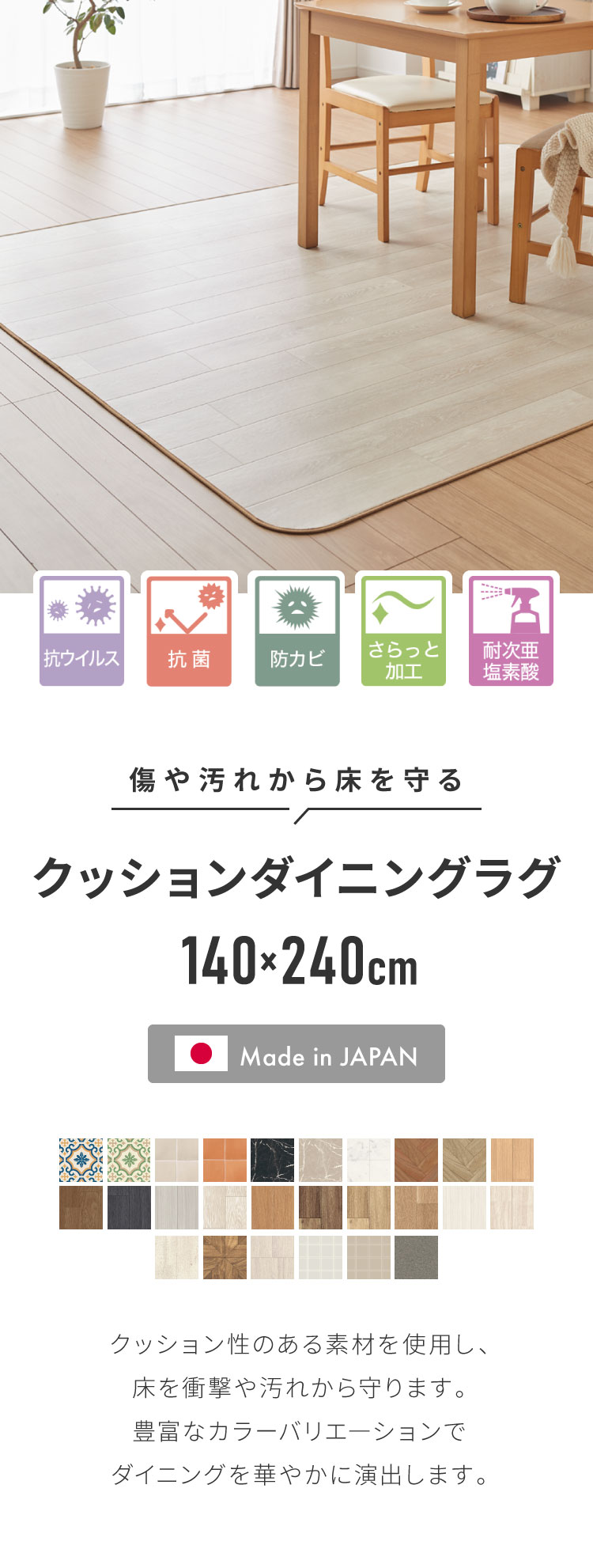 クッションフロア 140×240cm ダイニングラグ 日本製 フロアシート 撥水 抗菌 防カビ 傷防止 フロアマット クッションシート ダイニングラグ 代引不可