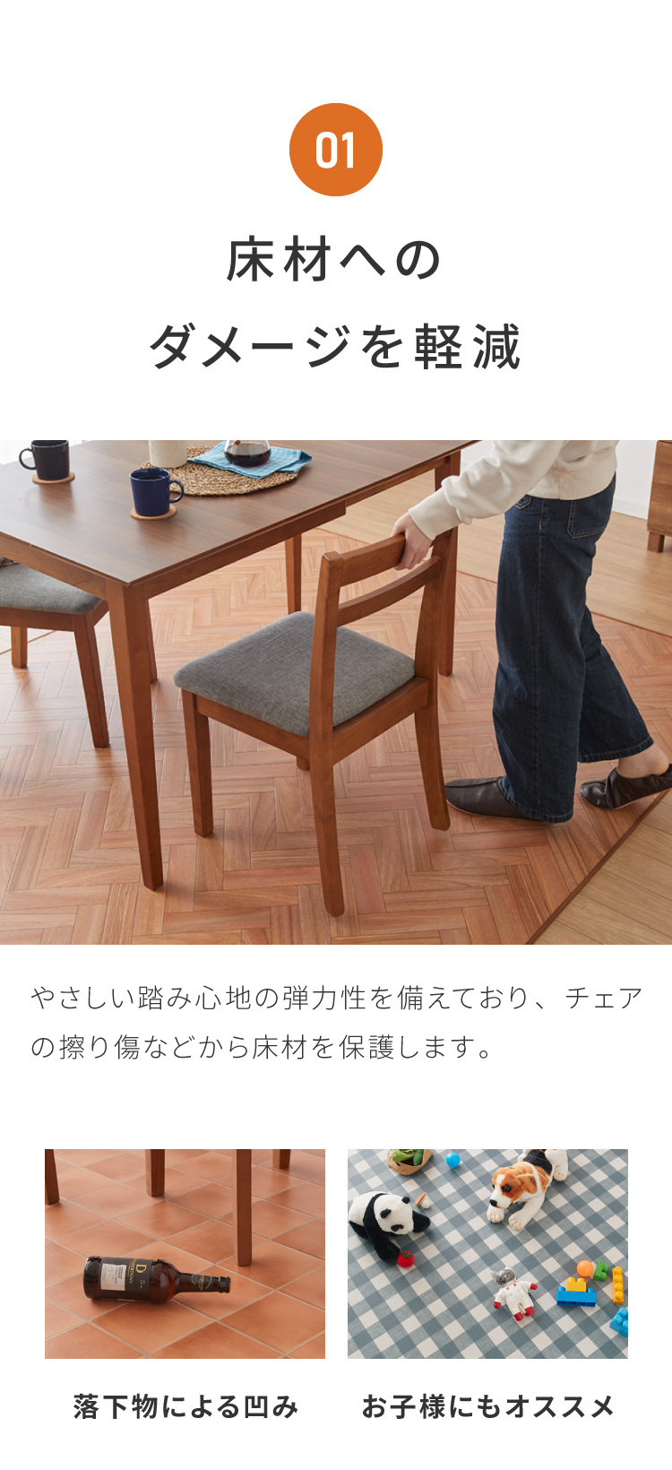 床材をキズや汚れから守り、小さなお子様やペットのいるご家庭や、床材を大切に使いたい新築のご自宅に。