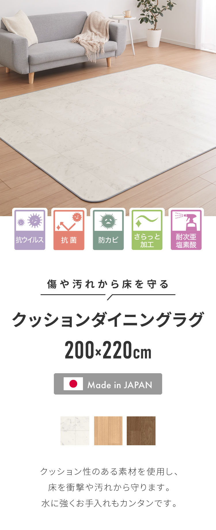 塩ビ素材なので撥水・防汚機能が施されており、汚れてもサッと拭きとれるダイニングラグ。床材をキズや汚れから守り、小さなお子様やペットのいるご家庭や、床材を大切に使いたい新築のご自宅に。退去時の費用が気になる賃貸住宅のお部屋にもおススメです。さらさらの表面でラグに汚れが詰まらず衛生的。汚れてもお掃除のしやすいダイニングラグで快適な暮らしづくりを。