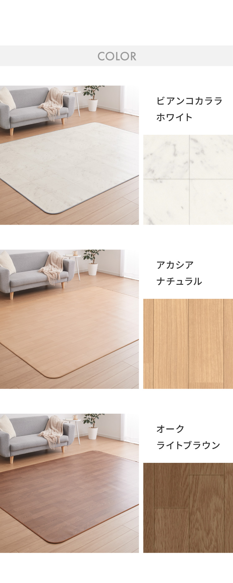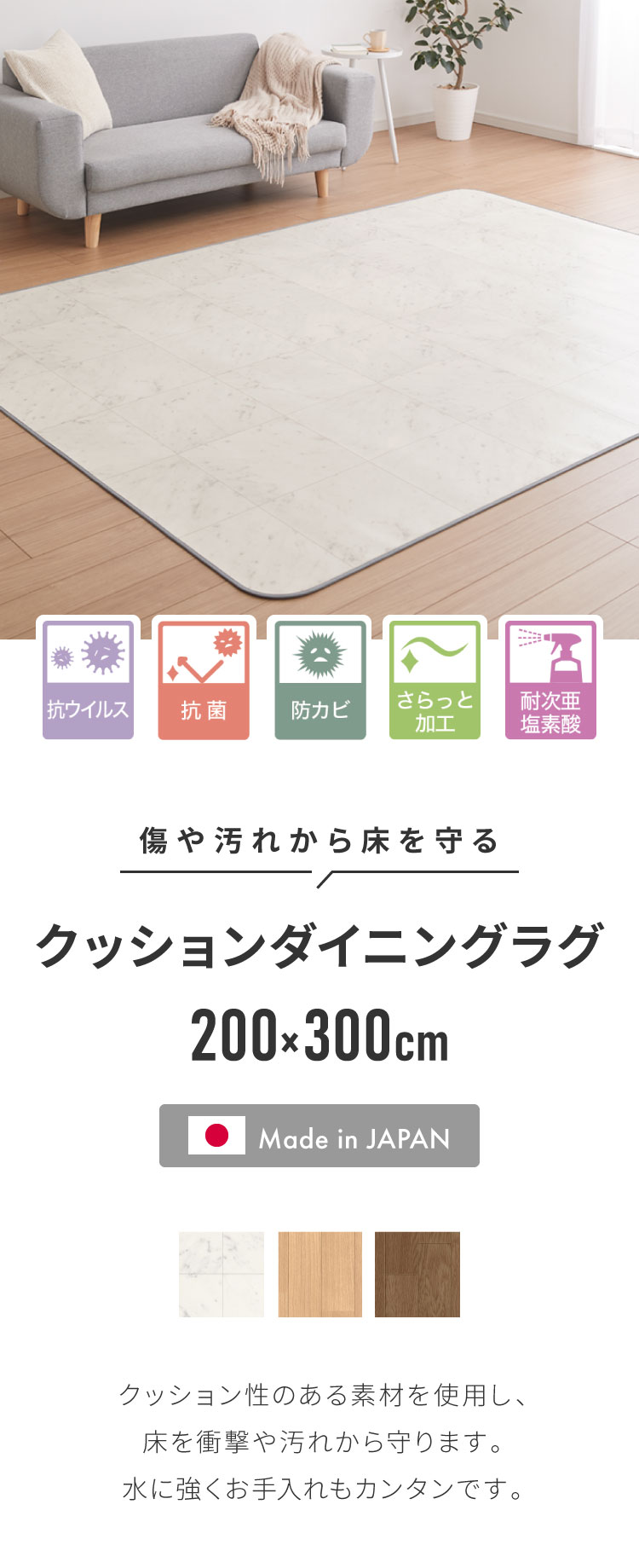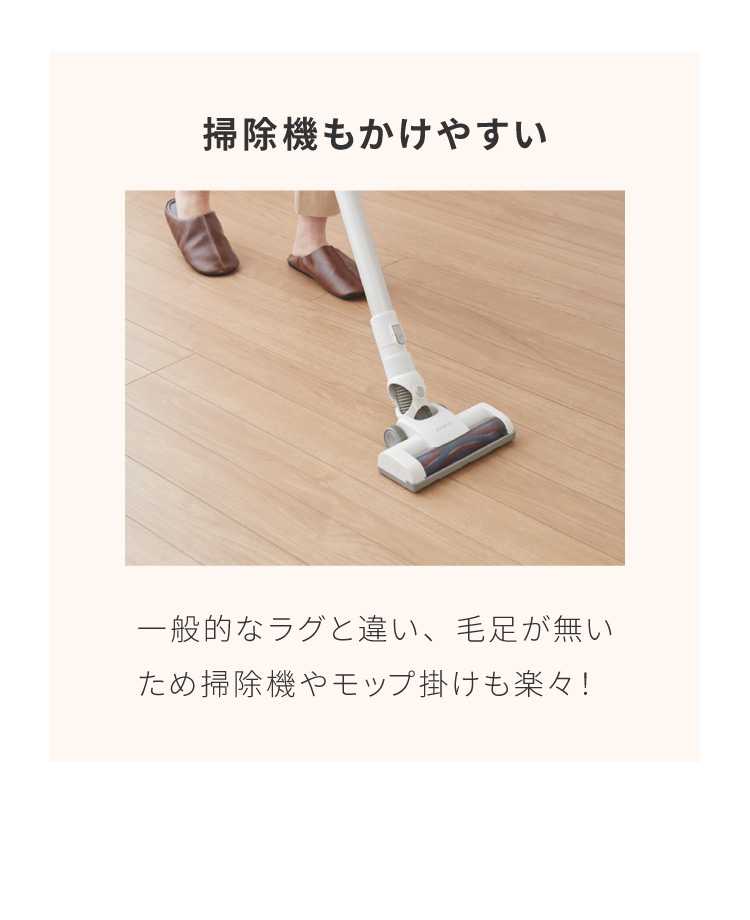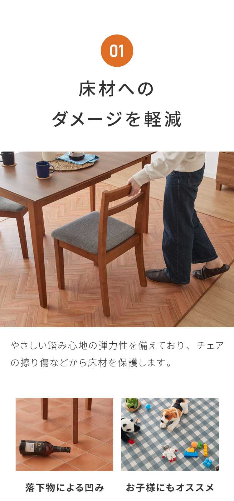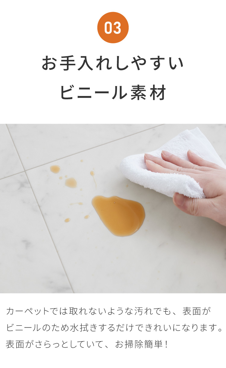塩ビ素材なので撥水・防汚機能が施されており、汚れてもサッと拭きとれるダイニングラグ。床材をキズや汚れから守り、小さなお子様やペットのいるご家庭や、床材を大切に使いたい新築のご自宅に。退去時の費用が気になる賃貸住宅のお部屋にもおススメです。さらさらの表面でラグに汚れが詰まらず衛生的。汚れてもお掃除のしやすいダイニングラグで快適な暮らしづくりを。