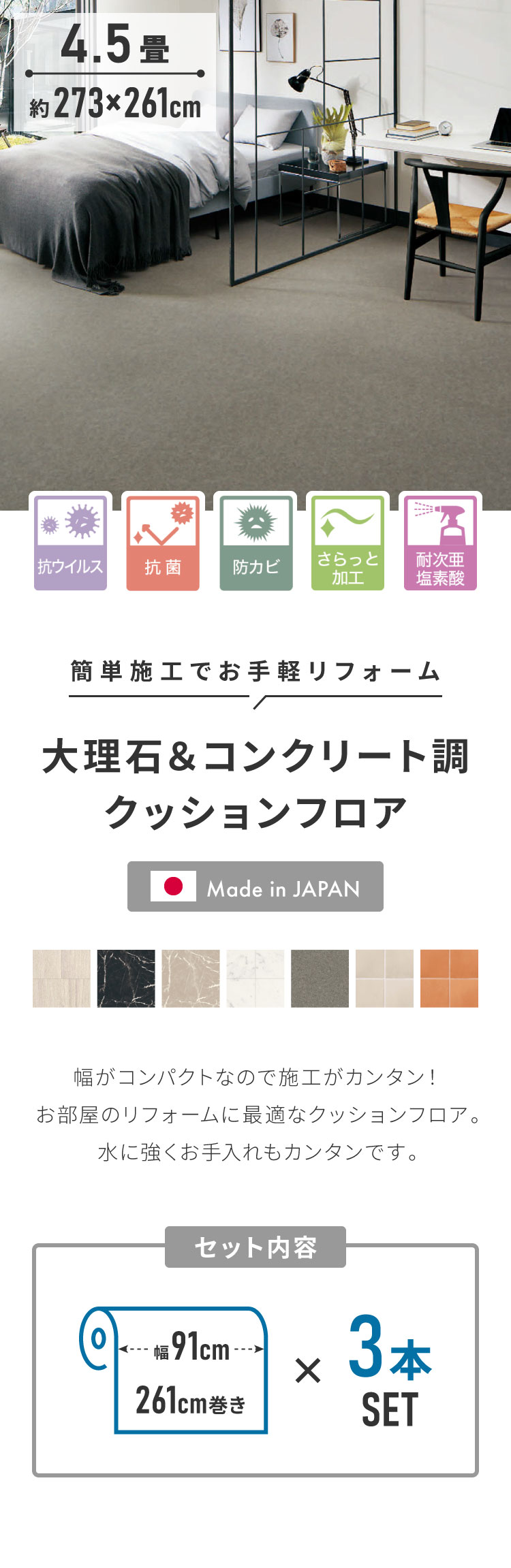塩ビ素材なので撥水・防汚機能が施されており、汚れてもサッと拭きとれる敷詰めクッションフロア。入居時のお部屋作りや、模様替えが簡単に行なえる敷くだけ簡単DIY。退去時の費用が気になる賃貸住宅のお部屋にもおススメです。さらさらの表面で汚れが詰まらず衛生的。汚れてもお掃除のしやすい床材で快適な暮らしづくりを。