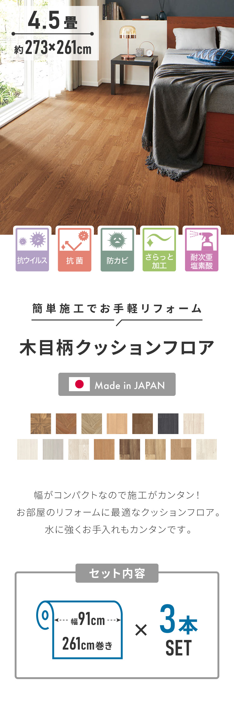 クッションフロア 4.5畳 木目柄 フリーカットシート 日本製 撥水 抗菌 防カビ 傷防止 フロアマット クッションシート ダイニングラグ 代引不可