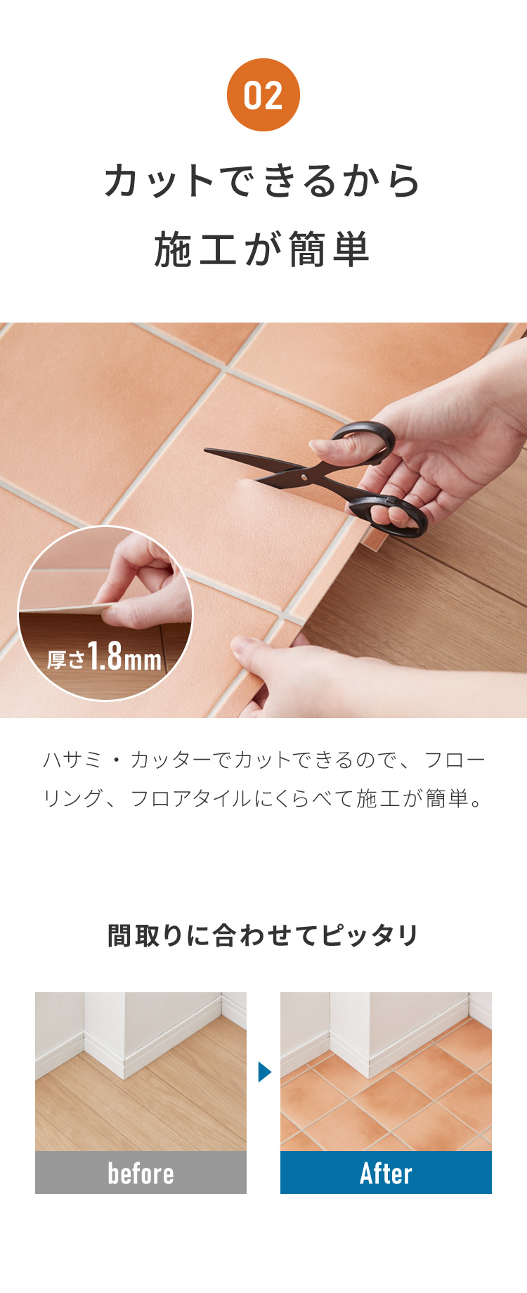 簡単施工なので賃貸にもおススメ。ハサミやカッターで簡単に切れるので施工が楽ちん。水に強いのでお掃除もカンタン♪
