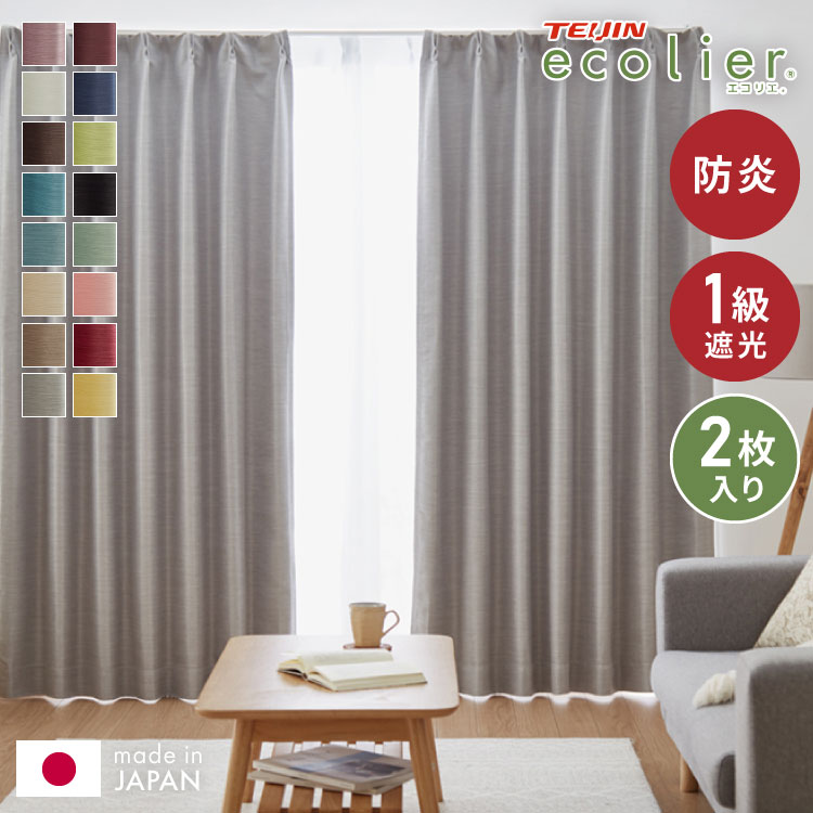 遮光カーテン 防炎 2枚組 1級遮光 2級遮光 幅100 150 200cm 帝人 TEIJIN エコリエ 洗濯可能 省エネ 遮熱 断熱 保温 節電 形状記憶 無地 シンプル 代引不可