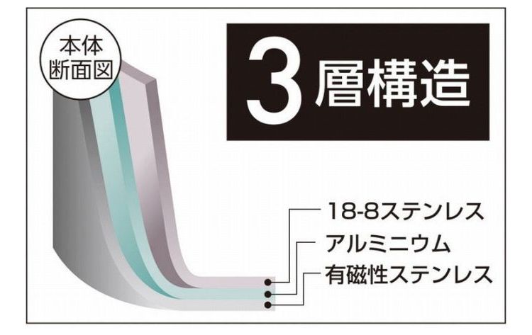 熟練の技巧、信頼の日本製。鍋の本体は、熱伝導性に優れたアルミニウムを耐久性と保温性に優れたステンレス鋼でサンドした3層構造(3LAYERS)。IHはもちろん、ガス火やオーブン調理、アウトドアでの焚火や炭火にも対応します。