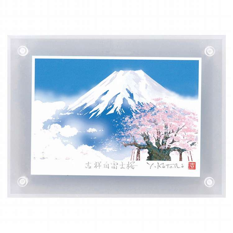 美しい色使いと鮮やかな発色が魅力的な吉岡浩太郎の絵を透明感が美しいフレームにセットしました。桜は合格祈念、旅立ちを、富士は出世、繁栄を招き、絶大な力があり、を高めるとされている、よりよい縁起物です。アクリルが紫外線から作品の色褪せ劣化などを防ぎます。スタンド式・壁掛けでもご使用いただけます。