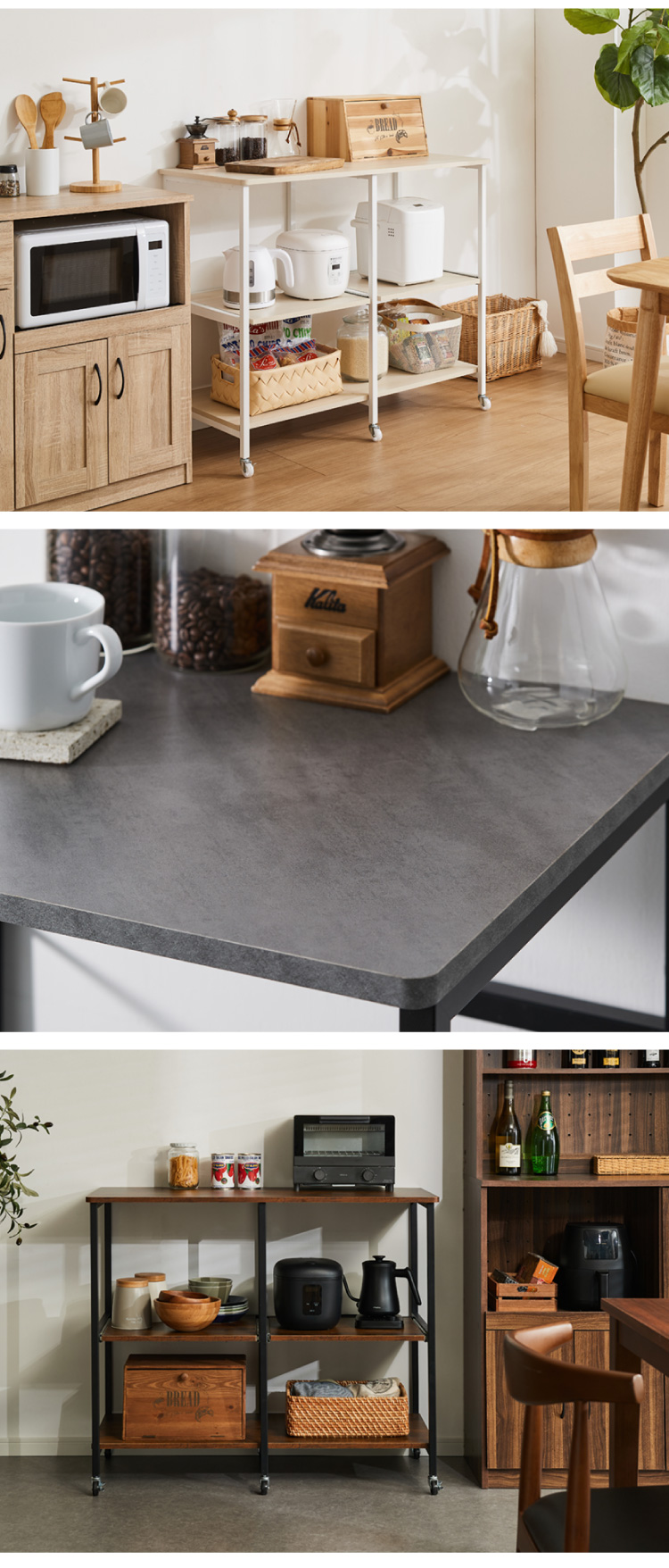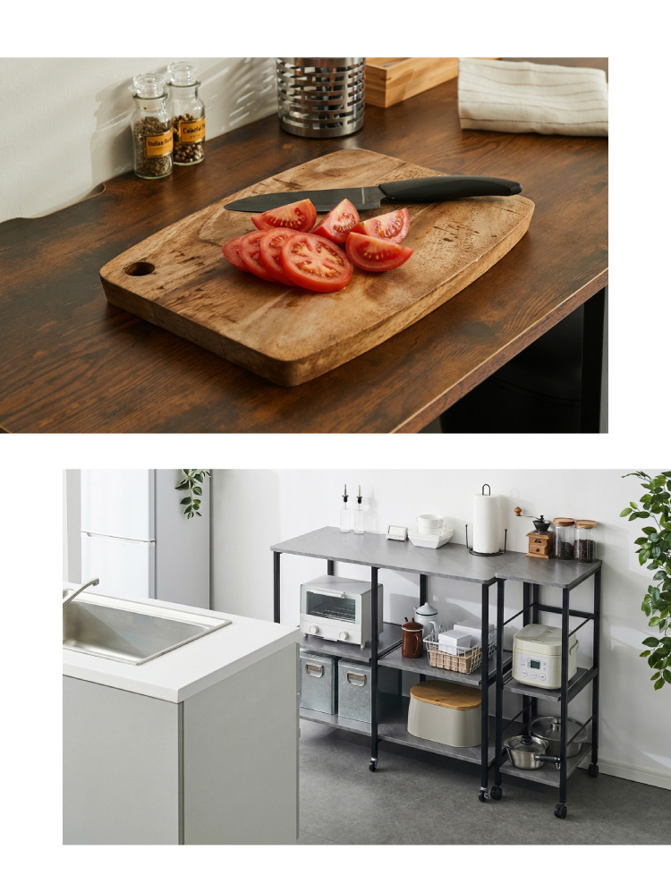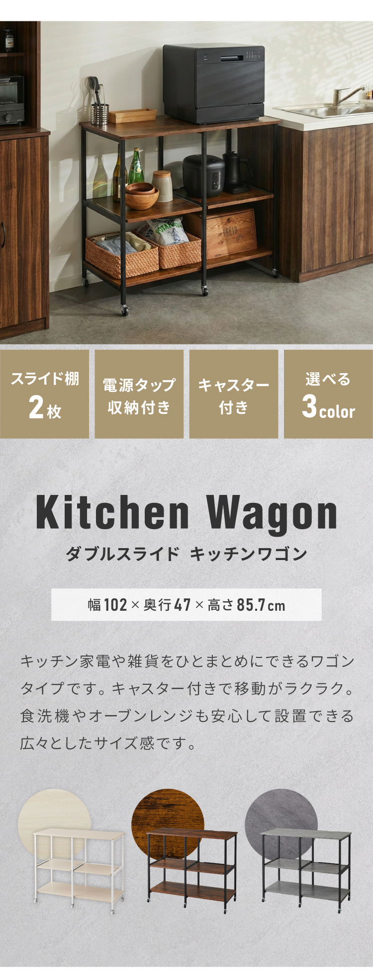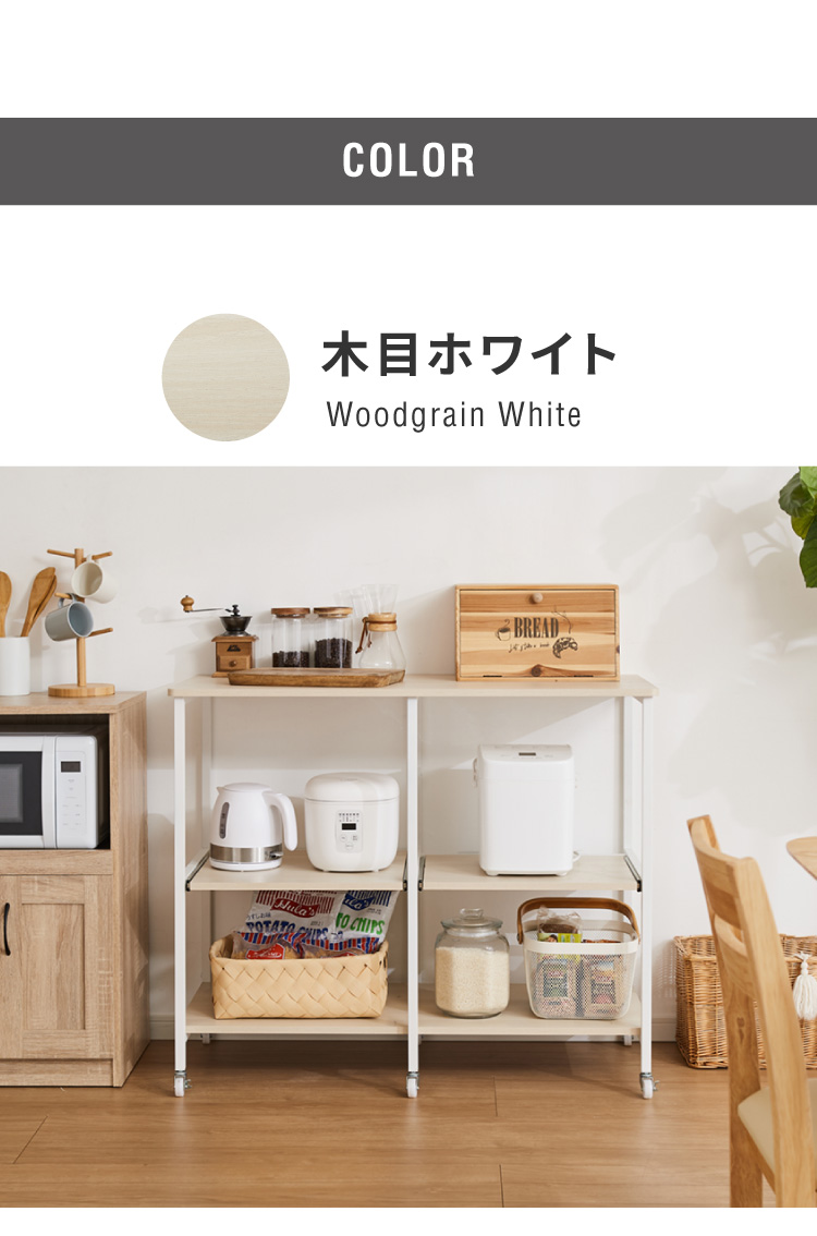 ・幅が約100cmと広々設計でかつスライド棚が2つあるキャスター付きキッチンラックです。