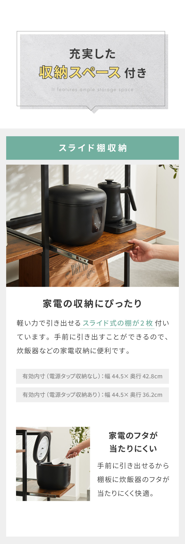 スライド棚有効内寸(電源タップ置きあり):幅44.5×奥行き36.2cm