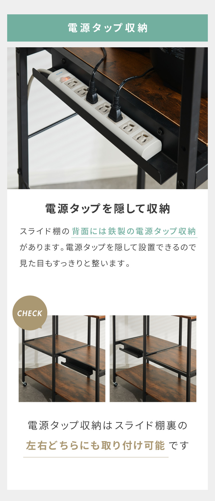・スライドレールの裏には電源タップ収納付き。左右どちらでも取り付け可能です。