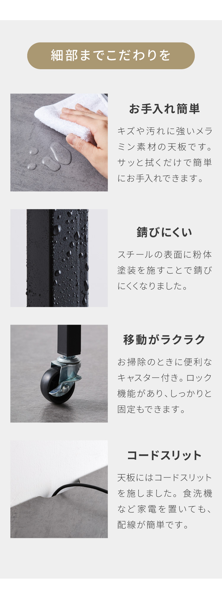 ・天板はコード穴カットを2か所施しているので、コードを通せます。