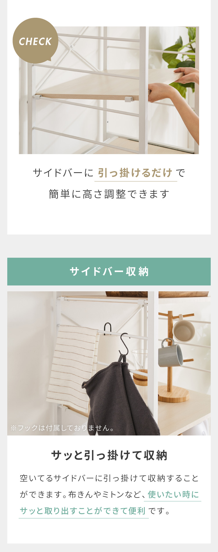 ・可動棚は2枚あり、引っ掛けタイプなので高さ調整も簡単です。