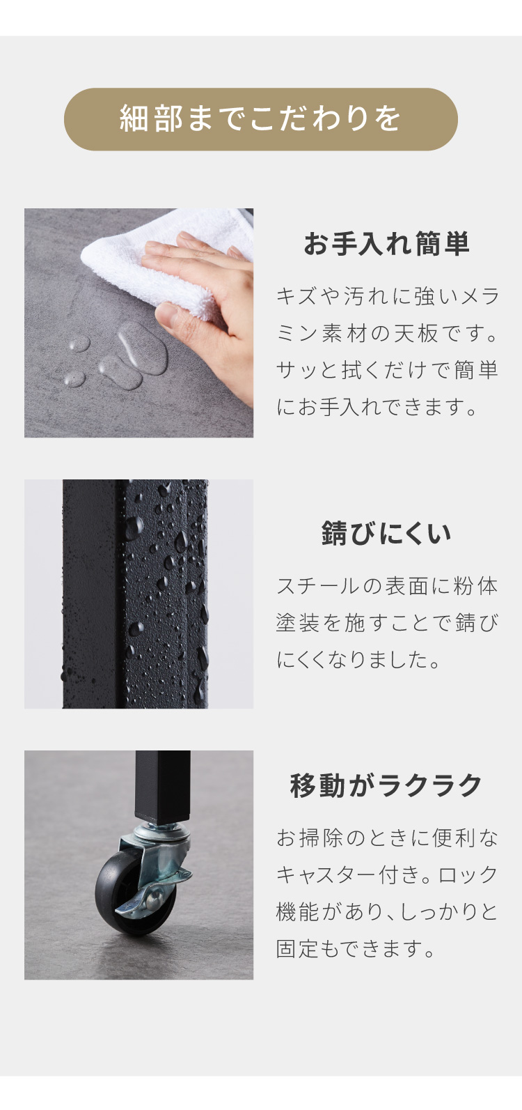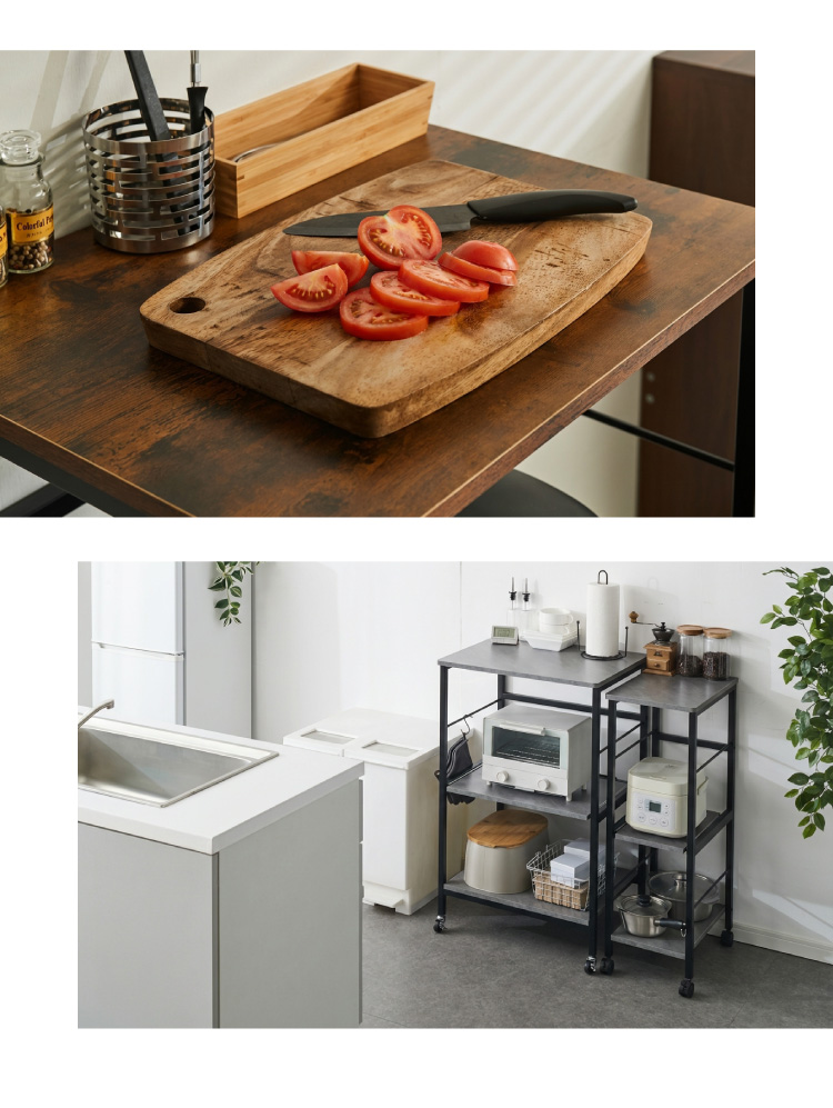 ・天板のサイズが57.5×45cmと広めな、キャスター付きキッチンラックです。