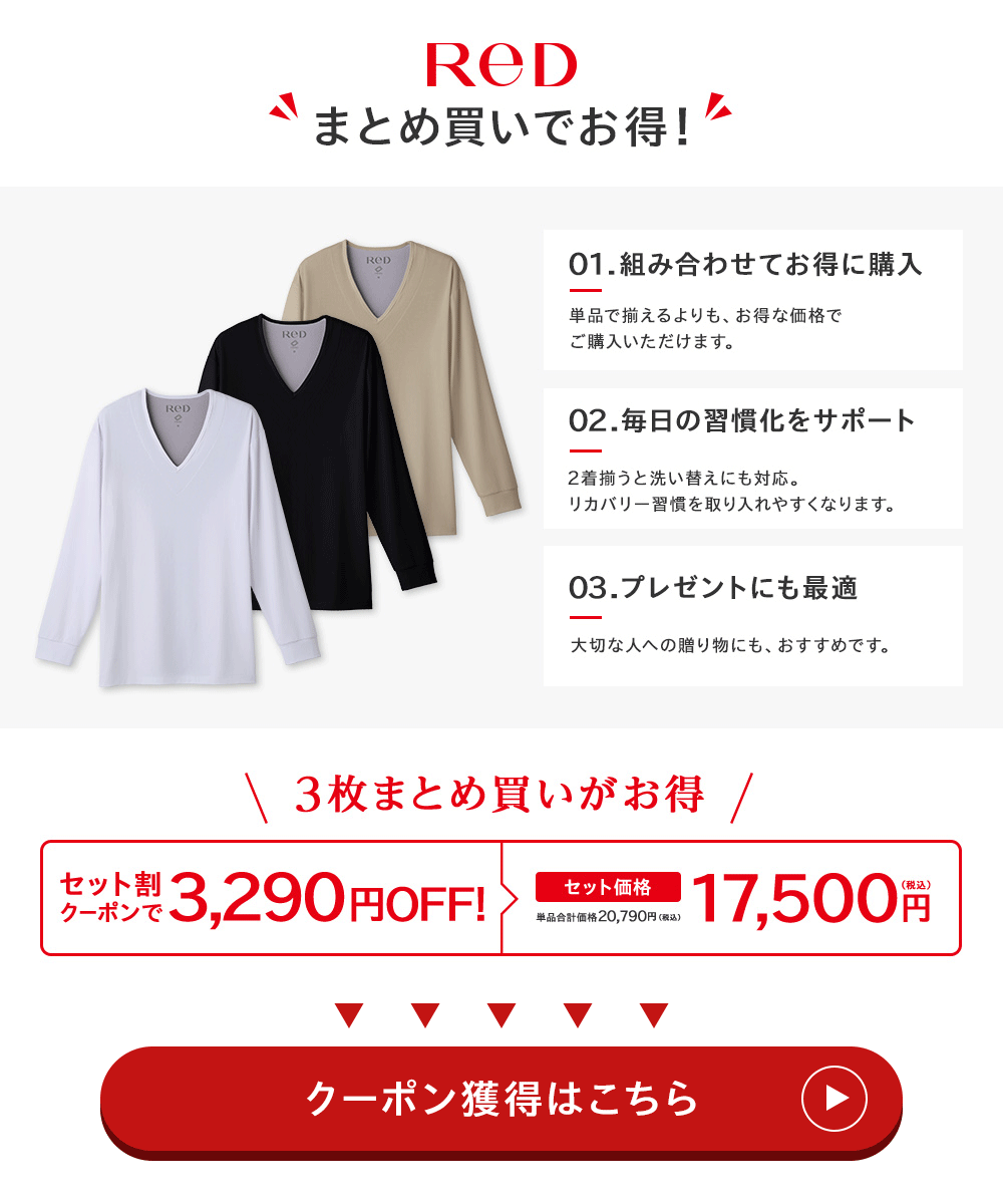 リカバリーウェア ReD レッド公式 肩コリ改善 Vネックインナー長袖 メンズ 男性 長袖 疲労回復 血行促進 プレゼント ギフト 一般医療機器 バイタルテック 爆買