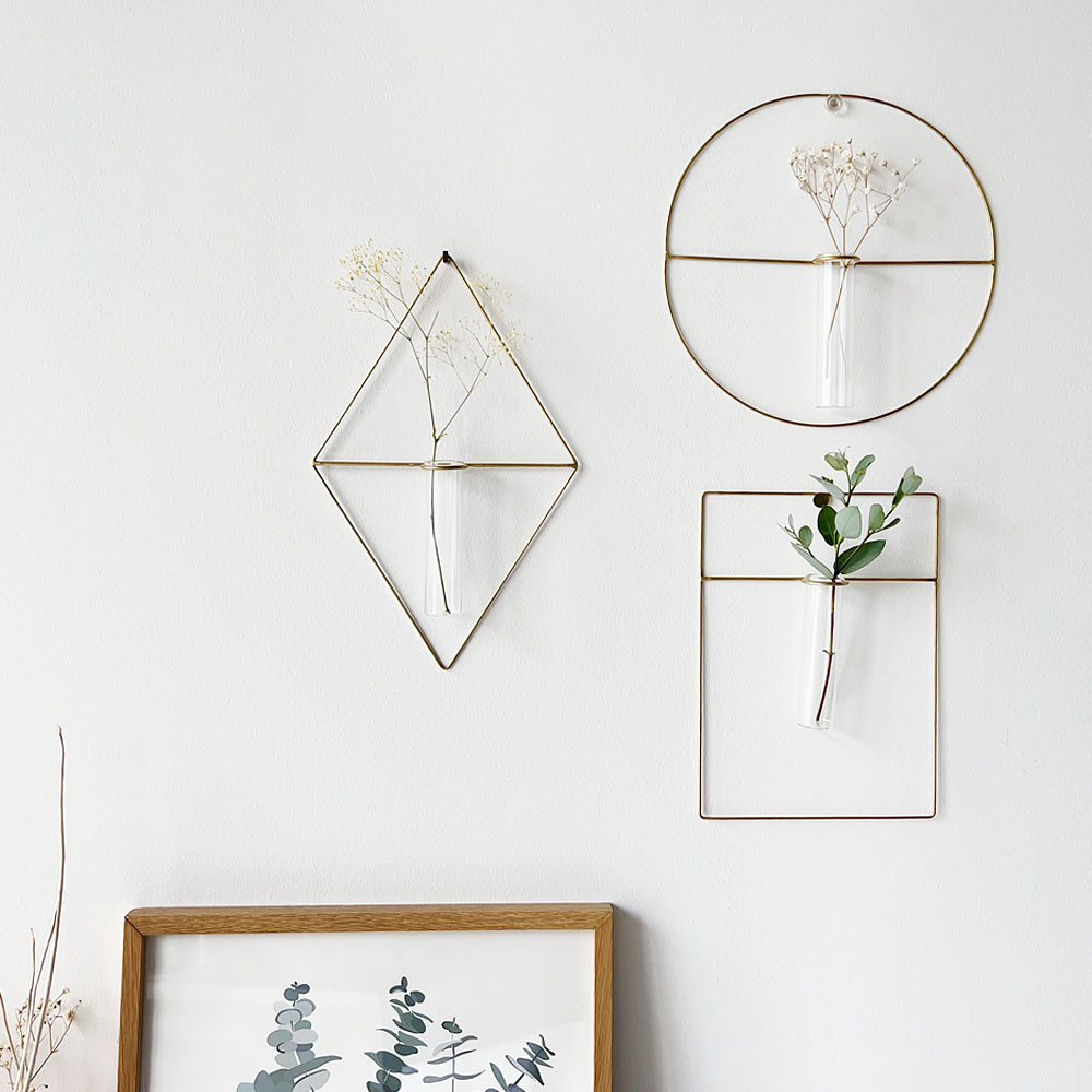 華奢な真鍮のフレームに、ちょこんとお花を一輪生けられる試験管サイズのベースが付いたデザインは、アート作品かのような佇まいで上品に壁面インテリアをお楽しみいただけます。