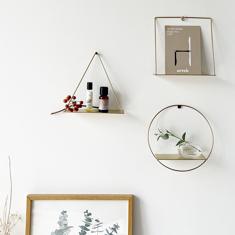 華奢な真鍮のフレームが、飾り棚にかけてほんのり立体的になったデザインは、アート作品かのような佇まいで上品に壁面インテリアをお楽しみいただけます。